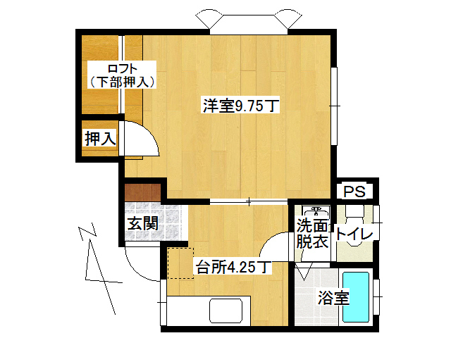 | 詳細間取 | 1DK (洋9.75帖×1、DK4.25帖、ロフト2.4帖) | ||